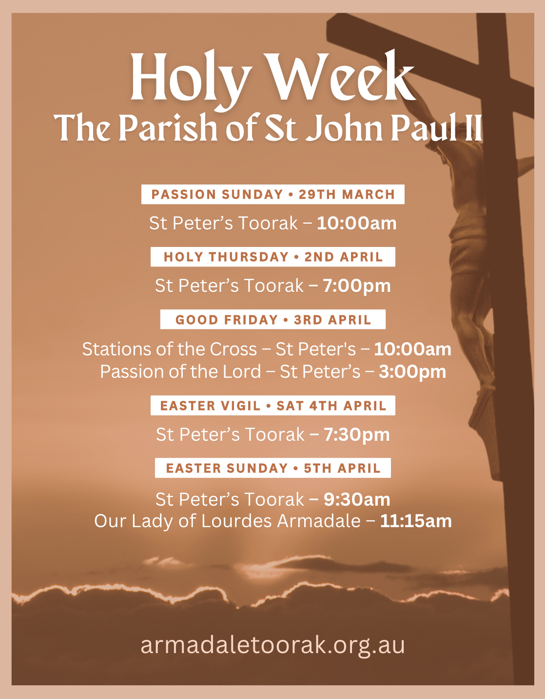 Across these days the Church walks with Christ through his Passion, death and resurrection, from the welcome of Passion Sunday, through the solemn liturgies of Holy Thursday and Good Friday, to the joy of Easter.